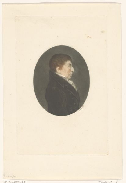 Editor: Here we have a rather refined engraving entitled “Ubekendt mandsportræt," or "Unknown Man's Portrait,” created sometime between 1767 and 1824. I’m struck by the sitter's severe profile and how the engraver managed to convey texture with such precision. What stands out to you in this particular print? Curator: Ah, precision indeed! It whispers of Neoclassicism, doesn’t it? A fascination with clean lines, the idealized form. But for me, it's that "unknown" that sings the loudest. He's just *anyone* now, but then? A life fully lived. Look closely. That tight collar… imagine the starch! He seems slightly… annoyed, perhaps? What do *you* make of his expression? Editor: Annoyed is interesting! I was thinking resolute. Maybe it's wishful thinking, imposing modern sensibilities on an 18th-century face. It's hard not to project, right? Curator: Project away! It's the beauty of art – the conversation it ignites within us. Perhaps he *was* resolute, steeling himself against a world on the brink of… what? Revolution? Did he sense it, this anonymous man facing an anonymous future? Notice how the artist places him inside a dark circle. The overall impression reminds me of coins of famous people. This stylistic rendering helps connect the sitter to powerful or historical figures. Editor: That's a perspective shift I hadn't considered. Makes me wonder about his potential societal position at the time. Curator: Exactly! That is a valid impression that is made possible by an artists' stylistic choice, or the historical and cultural context surrounding a work. He’s a ghost in elegant attire now, but for a brief, brilliant moment, he existed. I learned to view artworks through different cultural references! Editor: And I see how an artist’s style, as you said, really defines how people think of a specific work, as you explained. Thank you!
