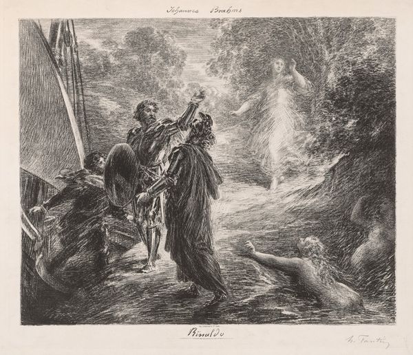 Curator: This print is entitled "Pantagruel." It is attributed to Gustave Dore. The medium is listed as engraving. What is your initial impression of it? Editor: Immediately, a sense of deep solemnity. The darkness contrasted by areas of striking detail, especially the figures clustered around what appear to be tombs. There's a profound air of mourning, or perhaps observation. What details strike you regarding the work's manufacture? Curator: The fineness of the engraving. The ability to render such fine lines. The cross-hatching must have taken so long to achieve. Consider the time invested and the precision required to build the tonal range with only the incisions on the plate. That's a level of skilled labor that really warrants contemplation. And what meaning do you take from this highly stylized image? Editor: To me, the tombs represent cultural memory. The characters gathered around suggest a community grappling with the past, and those in period-specific garb establish historical continuity and a Romantic sense of bygone eras. I'm wondering what this evokes when you consider material constraints? Curator: Knowing that the print could be widely reproduced through a fairly standardized mechanical process underscores the shifting relationship to ownership of artistic interpretation and reception, as well as distribution in an era before easy dissemination of art and imagery through digitization. Each individual viewing would engage with it on a highly individual level. Editor: The widespread dissemination absolutely changes the reading, almost like a myth evolving with each telling. What do you feel is the overriding mood or impression the artwork creates on the viewer? Curator: It's somber, yet also full of human labor. To really *see* the lines created to produce this scene forces you to contemplate not only the time, but also the effort of the artisan in its material reality. Editor: Agreed. Thinking about that artisan gives an intimacy that tempers the cold detachment of death depicted here. The work embodies the spirit of remembrance, transformed through craftsmanship.