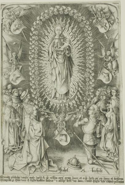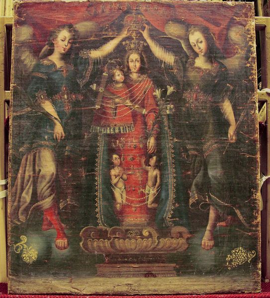 Editor: So this is *The Virgin of El Camino with St. Fermín and St. Saturnino*, made with watercolor in 1773 by Nicolás Enríquez. It strikes me as such an interesting composition—it's layered and has a dreamlike quality, a little like a memory. What stands out to you about this piece? Curator: For me, it's how this painting acts as a visual echo chamber. Notice the Virgin, central and grand, seemingly emerging from a sculpted base. But look closer: the Virgin *is* the sculpture. She becomes a powerful cultural symbol, a convergence point for faith, identity, and history. See the drapes and angels – aren't they reminiscent of theatrical staging? Editor: Yes, absolutely. It feels very staged. Curator: Exactly! This pictorial device elevates the figures—making them icons, reinforcing their symbolic significance. Now, consider Saint Fermín and Saint Saturnino below. Editor: They appear like foundational supports, grounding the Virgin. Curator: Precisely! They root her in a specific cultural context. Note the coat of arms, it functions almost as a signature, staking a claim to heritage and belonging. The whole painting is doing something similar - how collective memory gets crafted and reinforced. What kind of dialogue do you think a viewer would have with this image at the time? Editor: I suppose that the message would be about the connection of the specific location or culture. But also, the style would suggest this location might not necessarily exist. So both reality and artifice mixed together! Curator: An excellent insight, this is how memory is both fact and art. The experience shows how the layering of cultural and religious imagery serves a dual purpose: celebrating specific saints, and cementing collective identity. Editor: I didn't even think about the constructed quality of collective memory, the piece makes me want to question and challenge them, too. Thanks so much for pointing this out!
