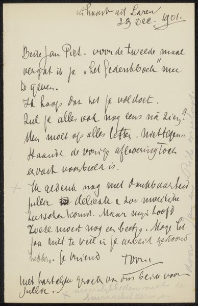 Editor: This work, "Brief aan Philip Zilcken," is possibly from 1896, made by Frits Roosdorp, using pen and ink on paper. It’s a handwritten letter, evoking a sense of intimacy. What do you see in this piece beyond its literal content? Curator: Beyond its surface, the letter becomes a potent artifact, whispering stories about social networks and intellectual exchanges of its time. I'm interested in what the act of handwriting signifies. How does it differ from a typed message, in terms of power dynamics, intention, and accessibility, specifically within the cultural moment in which this was created? Editor: That's interesting. I hadn't considered the implications of handwriting itself. Is it a statement in its own right? Curator: Exactly! The deliberate choice of handwriting speaks volumes, possibly reflecting an era valuing personal touch, direct communication and unique expressions before mass production standardized communication. Who were Roosdorp and Zilcken in relation to each other? Was there a hierarchy, perhaps gendered or class-based, influencing the form and content of this "brief"? What theories about social performance might be relevant here? Editor: So, examining their relationship and social context could unlock a deeper understanding. The Dutch Golden Age was so dominated by wealthy elites... I guess that wealth comes with unique ways of showing one's expression. Curator: Indeed. Let's consider how their status afforded them the luxury of time and materials for handwritten correspondence, and then how the exchange further solidified their place in a particular social strata. This one letter can tell us much about who held the power in those days! Editor: I never considered a letter to be a possible tool for studying social power. Curator: Texts like this open a portal to examining marginalized voices absent from dominant narratives. These letters act like pieces of evidence, providing insight into a past still relevant today. Editor: I will be sure to think more carefully on all the layers contained in letters! Thanks.