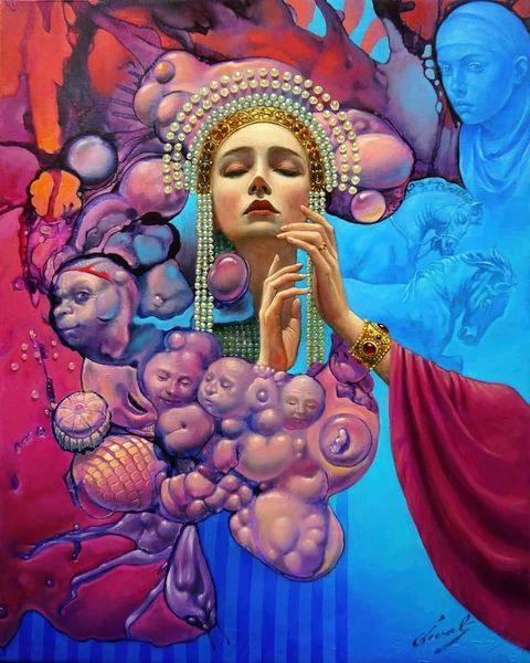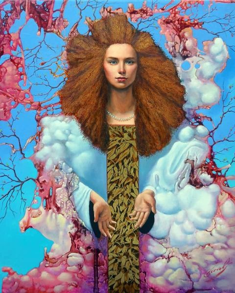 Michael Cheval made "Lady Of Gold Rush" with oil paint, though I couldn't tell you exactly when. The gold is the first thing you notice, right? Look at the swirls, the repetitive shapes that make up her hair and crown. It's all very deliberate, like a kind of symbolic language. It reminds me of Gustav Klimt, but with an added surreal twist. There’s something so evocative about the textures, the way the paint seems both smooth and layered, thick in some places, thin in others. It gives a sense of depth, as if the painting is alive. Then there’s the contrast of the light blue background, see how the lines make their way around the gold shapes? It creates a push and pull effect, a tension that keeps your eye moving. It's this balance between control and chaos that makes the piece so engaging.