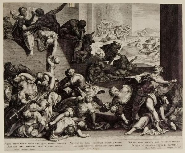 Pietro Aquila created this print titled 'Sabijnse maagdenroof' around 1650-1700. The composition is dominated by a flurry of bodies in dynamic poses, rendered in stark black and white, which conveys a sense of chaos and forceful energy. The figures are tightly packed together, creating a dense, almost claustrophobic scene. Aquila masterfully uses line and texture to distinguish between the figures and the classical architectural elements, enhancing the drama of the abduction. The bodies are intertwined in a complex and dynamic arrangement, which evokes the emotional intensity of the moment. We may interpret this intensity as a Baroque fascination with drama and emotional expression. The print engages with complex issues of power, gender, and representation, as it encourages viewers to question the underlying structures of this historical narrative. The dramatic interplay of light and shadow, combined with the dynamic composition, invites ongoing interpretation and re-evaluation.