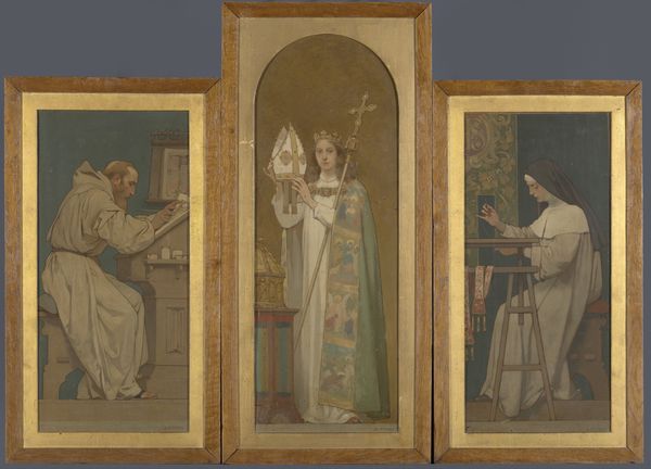 Curator: Here we have Arthur Hughes' watercolor titled "The Annunciation," which can be found here at the Birmingham Museum and Art Gallery. It was purchased by the gallery in 1891. Editor: Well, right away, the chromatic restraint strikes me. It feels muted, almost dreamlike, with those gentle washes of lavender and cream. Curator: Indeed, Hughes departs from strict realism, embracing a symbolic language evident in the angel's idealized features and Mary's posture. The Pre-Raphaelite influence is clear here in its fidelity to nature. Look at how precisely rendered the flowers and foliage are. This is very characteristic of their dedication to truth in representation. Editor: I appreciate your read, but I wonder how much that so-called "truth" caters to a male gaze that often idealizes and de-contextualizes women. Mary’s passivity, the angel's ethereal beauty—it all plays into a narrative where female agency is minimized, wouldn’t you agree? We cannot dismiss the politics inherent in its imagery. Consider how it reinforces patriarchal norms about female purity and obedience. Curator: I see your point. And while such issues about the subjugation of women and society are important, in purely formal terms, notice how Hughes uses the architectural frame within the painting. The gothic arch mimics the physical structure of the painting itself. Editor: Right, and thinking more about that architectural detail— the "domestic" space represented can also be considered through a socio-political lens, can't it? By placing the annunciation in such an environment, doesn't Hughes domesticate this pivotal moment, reducing Mary's role to a mere household affair, far from the world-changing implications of her acceptance? Curator: Your analysis broadens my appreciation of Hughes' work and reveals other interpretative possibilities. I originally tended to perceive more structural and aesthetic achievements within this painting. Editor: Likewise, reflecting upon the forms and compositional aspects you raised encourages an alternative reading in connection with broader cultural issues that persist today. I am grateful to you.