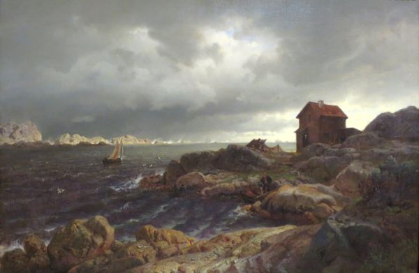 Hans Gude captured this scene, The Harbor, with oils, freezing a moment where nature and humanity converge on the canvas. Dominant here is the motif of the ship, its red sails billowing, a symbol traversing epochs. From ancient Egyptian funerary boats, ensuring passage to the afterlife, to Viking longships embodying exploration and conquest, the vessel is a potent image. Think of the Ship of Fools in medieval allegory, or even, more recently, the immigrant ships that carried so many to the new world. Note how the harbor is not a safe haven. Instead, the turbulent waves crashing against the pier suggest a confrontation with the unknown, a struggle mirrored in the human spirit, hinting at the anxieties and hopes intertwined with journeys and crossings. The pier evokes mankind's dominance over the natural world, but its fragility when faced with the brute force of the ocean. Ultimately, the ship in Gude’s harbor reminds us of the cyclical nature of human experience, its ever-present duality of risk and reward. The human need for exploration and the courage required to sail into the unknown continues to resonate across time.