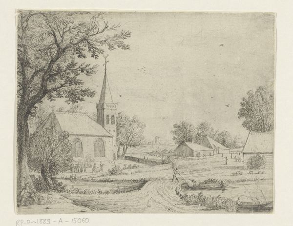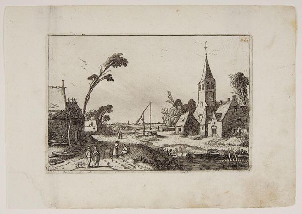 Curator: Here we have Esaias van de Velde’s "Village Scene with Farmhouses, Church and Water Pump," a detailed etching from 1614. It resides here at the Rijksmuseum. Editor: My first impression? It feels like a glimpse into a quieter, simpler time, doesn't it? The intricacy achieved with etching is astounding—each tiny line shaping a whole world. You can almost smell the hay and hear the gentle rustling of leaves in the wind. Curator: Precisely. Velde's masterful manipulation of the etching technique allows us to observe the burgeoning Dutch countryside and its industrious people. We can appreciate the craft involved, as the etching process demanded precise labor. Copperplate engravings such as this became important visual tools, feeding into the Dutch Republic's rising global trade. Editor: Thinking about that, it’s interesting to see how even in what looks like a calm rural scene, there's this undercurrent of social fabric being woven, wouldn't you say? Look at the clothing; note the gathering near the water. One wonders, what are they talking about? Love it! Curator: Indeed. Note the inclusion of the water pump, a fairly new technology at the time that, coupled with the burgeoning church in the background, allude to progress and societal cohesion. Velde demonstrates both awareness and, perhaps, implicit commentary on evolving societal values. Editor: Absolutely. It makes you ponder about the human element amidst daily life; those stories etched—quite literally—into the landscape. Plus, for a village scene, I feel it balances the rustic and the aspirational... that church steeple really piercing the sky. It hints at higher things, metaphorically. Curator: That’s quite astute! Velde captures the burgeoning wealth and social consciousness of the Golden Age through seemingly mundane rural subject matter. We observe societal ideals in the details, such as improved infrastructure and public gatherings in his depiction of this little village community. Editor: You’re right; there's a lot of life crammed in that tiny space, not simply landscape; there's aspiration. And those figures almost feel like us, like ancestors. They look like folks busy navigating their lives centuries before us, seeking connection by that well! So simple but, in reality, really touching. Curator: A superb analysis; through the materials and execution of his prints, Van de Velde documented the evolving social landscape around him. Editor: Well, between Velde's etching work and the Rijksmuseum's exhibit work, history gets a chance to have a voice!