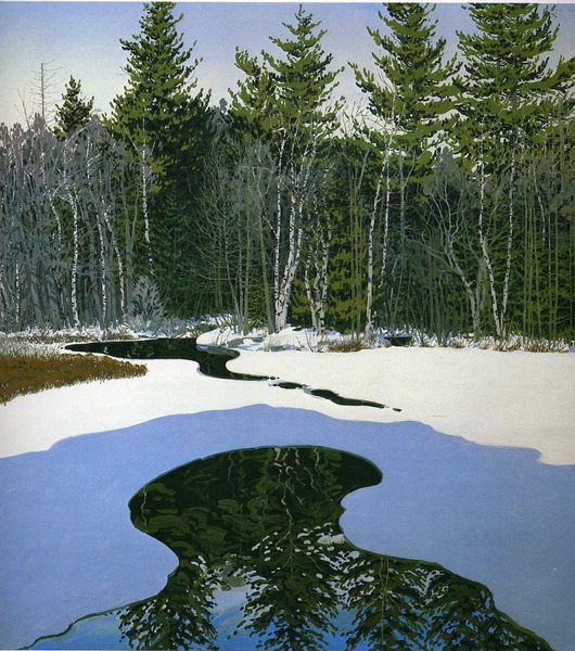 Eyvind Earle's "Red Barn and Tree Snow" is made with flat opaque colours and crisp sharp lines, which creates a kind of stylized simplicity. Look at the tree; it's not just a tree, it’s this incredible tower of vertical lines, interrupted by these dollops of bright snow. The colours are so controlled, so graphic, that the textures almost feel printed, even though it’s a painting. The heavy black branches reach out against a cool, twilight sky, and that red barn in the background has this amazing glow, so warm, so inviting. Then, there’s the snow, clinging to everything, softening the edges just so, but still rendered as these chunky, almost geometric shapes. I'm reminded of the graphic sensibility of someone like Charley Harper, but with a touch of the transcendental like Agnes Martin. It’s about seeing the world distilled down to its most potent forms, and feeling the sublime in something so simple. It reminds us that less can definitely be more.
