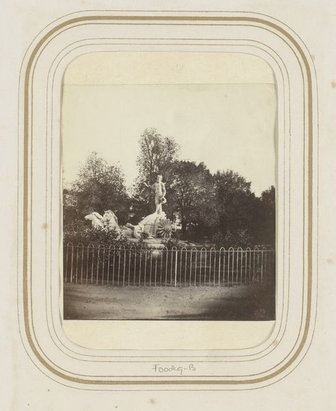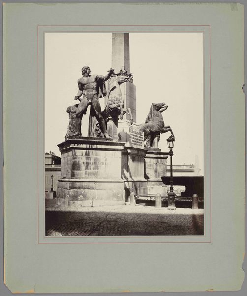 Curator: There's a photograph by Juan Laurent, dating from around 1865, depicting the equestrian statue of Philip IV in the Plaza de Oriente in Madrid. Editor: It strikes me as oddly romantic, almost wistful. The sepia tones lend this monumental bronze, this statement of power, a gentle melancholy. Curator: That contrast is precisely what I find fascinating. Laurent was capturing a changing Madrid, and statuary like this, with its deliberate neoclassicism, was often employed to project authority amid shifting social landscapes. Think about it – bronze and stone intended to communicate permanence and timeless reign are now captured in a fleeting photographic moment. Editor: And isn't there an inherent fragility in photography, particularly at this time, despite its claims to objective documentation? Laurent has composed the shot, choosing an angle and perspective. We aren't seeing objective truth here. We see only how this photograph’s context has constructed authority and filtered how we view this figure, a symbol that is simultaneously glorious and a bit… diminished. Curator: Exactly. And considering the Plaza de Oriente was a key site for political demonstrations and royal displays, photography further complicates how these spaces and figures function in the collective memory of the period. Was it truly an attempt to fix Philip IV and neoclassicism within the fabric of the city or simply documentation to show how a space can transform, how people adapt with it through these tumultuous, historical eras? Editor: The fact that it's in a museum now, far from the Plaza, further adds another layer. It is like seeing a ghost from history. Its permanence now lies not in its function but what it stands to symbolize about history: statues crumble, regimes fall, photography preserves, if imperfectly, what was intended to last forever. Curator: Very eloquently said. Laurent’s photograph functions almost like a memento mori, quietly reminding us of the impermanence of earthly power, framed within an echo of a grand artistic moment. Editor: Yes, it asks if memory can live forever in a museum like the people did when it was a monument. It seems the answers can change for everyone!