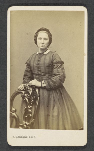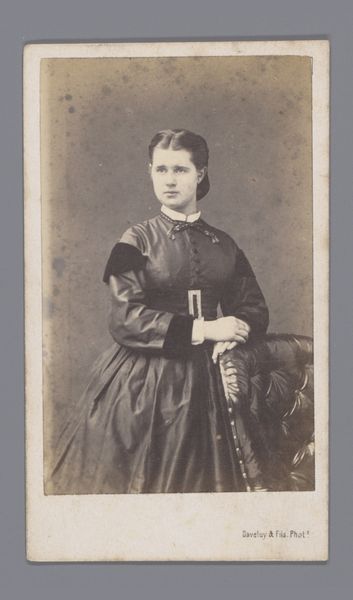 Editor: This photographic print, “Portret van een onbekende jonge vrouw uit de familie Marmelstein,” dating from 1867 to 1870, is attributed to S. van Caspel & Stapert. It's quite striking, with the sitter’s dark dress contrasting with the pale background. What jumps out at you when you look at this photograph? Curator: I'm immediately drawn to the materiality of this piece. Photography in the 19th century was a laborious process, involving the careful preparation of glass plates, precise timing, and controlled chemical reactions. Look closely at the chair. How accessible would furniture like this have been, and what does its inclusion here tell us about aspirational social status? Editor: I hadn’t considered that! So, the choice of the chair highlights more than just an aesthetic element, but the effort for social promotion. Curator: Exactly! Consider also the sitter’s clothing. What kinds of industries existed to create it, and what forms of labour were involved? Notice, also, the very visible chemical imperfections that came to be viewed as ‘imperfections.’ This really challenges the traditional notion of ‘high art.’ It wasn’t painting, but the intense effort to achieve the desired result challenges art's definition. Editor: So, understanding the materials and production provides a rich context for appreciating not just what's depicted, but the wider economic and social context of its creation. Is this where the value truly lies? Curator: Partly. By examining the labor and processes embedded within the photograph, we recognize a complex network of making, not just artistic talent, and that’s important. We avoid elevating ‘taste’ and look to understand historical reality. Editor: That’s fascinating. I see the photograph in a completely different light now, less about a posed portrait and more about the physical and social environment that brought it into being. Curator: Indeed. It moves our attention from the single author to wider cultural production. A materialist perspective enriches our perception of any work, particularly something as seemingly simple as a photographic portrait.