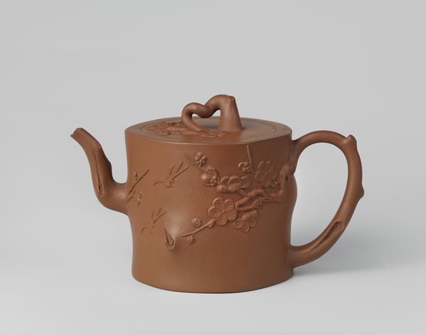 Curator: I'm immediately struck by how grounded it feels. The earthy color, the simple form… it whispers of quiet mornings and solitary rituals. It's modest, but elegant at the same time. Editor: Indeed. What you are seeing here is a teapot, dating back to around 1700. Its creation is attributed to the skilled hands of Arij de Milde. Made with ceramic and stoneware elements, the baroque stylings place the teaware in a larger conversation around the decorative arts tradition and what materials communicated socially at that time. Curator: Ceramic! That’s part of its charm, I think. There’s such an honesty to it, the way the fingerprints of the maker can be so present. You imagine the clay being shaped and fired and then finding its way into someone’s home… It has an intimate, everyday magic to it. Editor: The techniques of its production definitely echo the period, when ceramic was gaining broader acceptance due to advances in kiln technology and glaze composition. With increasing availability of resources, teaware became increasingly important in commercial and social trading routes in the Netherlands and abroad. The presence of decorative floral imprints speaks to consumer appetite and interest in the luxury object as well. Curator: Look at the floral decorations—they’re so subtle. I wonder if they have some symbolic meaning. What do you suppose a bloom represents? Editor: Hard to say for certain, of course, without direct documentation. It is reasonable to infer that depending on its destined consumer market or trade partners, it may reference localized narratives surrounding botanical elements or more abstracted ideals concerning status, the passage of time, nature, etc. Curator: Thinking of the materials, the Baroque flourishes—it suggests this teapot likely sat in rooms where other ornate items signaled both wealth and knowledge. Not too bad for something as simple as having tea! Editor: Absolutely. Examining these objects really exposes broader histories of production and the evolving ways our consumption ties us together. Curator: Well, looking at it has made me want to brew a pot right now. Maybe that’s the point of all decorative art after all. To give some beauty to everyday acts.