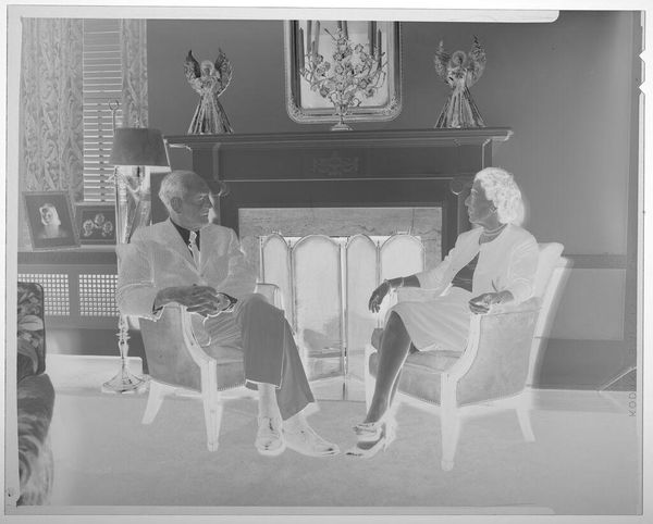 Curator: This is an untitled photograph by Jack Gould, showing a man and woman at a bar, seen from below. Editor: It feels clandestine, doesn't it? A low-angle shot imbues the subjects with a sense of power, though the monochrome adds a layer of vintage vulnerability. Curator: Absolutely. The composition, with its focus on the couple, their closeness, speaks volumes about gender dynamics and social interactions within the confined space of a bar. Editor: The bottles on the bar echo classical still-life compositions, don't you think? Reminders of pleasure, but also transience, the fleeting nature of the moment. Perhaps even symbols of the 'working man' and 'working woman' Curator: That's a sharp observation. It certainly provokes thoughts about the roles they play, both individually and as a unit, in a society that often seeks to define and confine. Editor: It's funny how a seemingly simple image can unveil such a well of cultural meaning. Curator: Indeed. It encourages us to question the narratives we construct, and to resist simplistic understandings of identity and power.