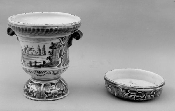 This vase and coaster were crafted by de Porceleyne Lampetkan, embodying the artistry of its time. During this period, the identities and roles of women were often prescribed, and it is seen here with a woman tending to plants in a garden, possibly alluding to domesticity and a connection to nature. It is important to consider the historical context in which images of women were constructed and consumed. Were they meant to celebrate the nurturing roles of women, or did they reinforce limiting stereotypes? Consider the vase's purpose and how its decoration reflects or challenges societal expectations. How does it make you feel, considering these issues? This vase prompts us to think about the interplay between art, gender, and the stories objects tell about ourselves.