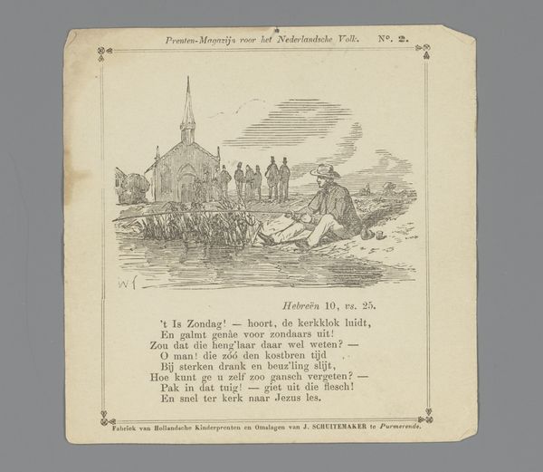 Isaac Weissenbruch created this print, ‘Prekende predikant in een kerk’, or ‘Preaching minister in a church’, using etching. This image offers a glimpse into the religious life and social dynamics within the 19th-century Netherlands. Weissenbruch, positioned within the Hague School, captures the somber atmosphere of a church service, perhaps reflecting the prevailing cultural emphasis on piety and moral conduct. The scene invites us to consider the role of the church in shaping individual and communal identity. The preacher, elevated in the pulpit, embodies authority and tradition, while the congregation below reflects a cross-section of society. The artist captures how societal norms around gender, class and religion are operating. Are these individuals finding solace and community, or are they subjected to the rigid doctrines of the time? The text at the bottom of the image offers a moralizing message which focuses on sin and shame. These themes prompt reflection on the emotional weight of religious expectation and the potential for both social cohesion and individual repression.