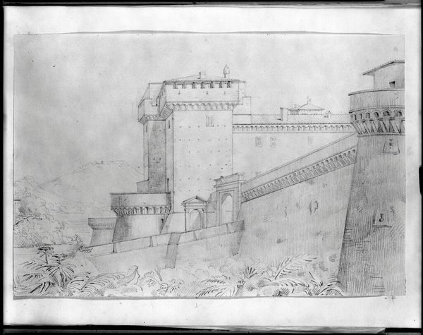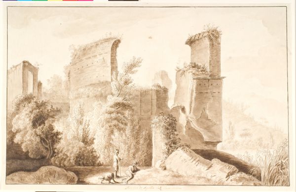 Curator: Here we have Florent-Fidèle-Constant Bourgeois du Castelet’s “View of an Italian Hill Town” in the Harvard Art Museums collection, a watercolor measuring about 8 by 12 inches. Editor: It feels ghostly, doesn't it? Like a memory half-faded. The hill town, almost monochromatic, perched precariously on that rocky outcropping... Curator: Precisely. Consider the materials: paper, watercolor. Bourgeois du Castelet, whoever he was, opted for readily available materials suggesting a more functional than decorative intention. Editor: I see a crumbling fortress, softened with wisps of trees. It whispers stories of sieges, romance, and long lost battles. Maybe the artist felt that too, a connection with the past, filtered through a personal lens. Curator: Perhaps, or perhaps the artist was simply recording the topography for future military campaigns. The lack of precise detailing lends itself to functional reproduction for strategic purposes. Editor: You might be right, but I still feel the ache of history here. Curator: And I appreciate the simple effectiveness of the materials to suggest so much about their time.