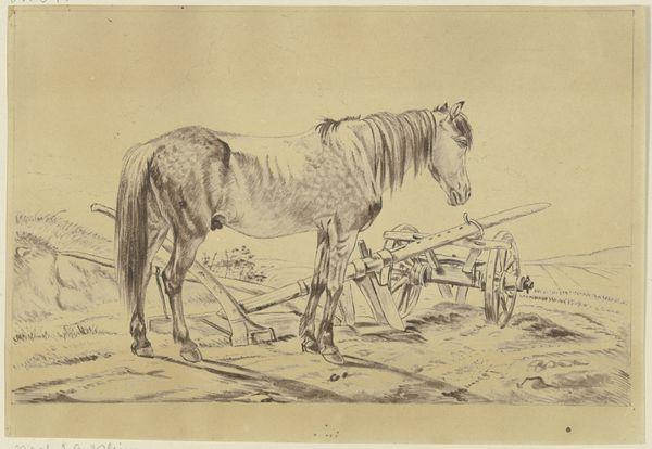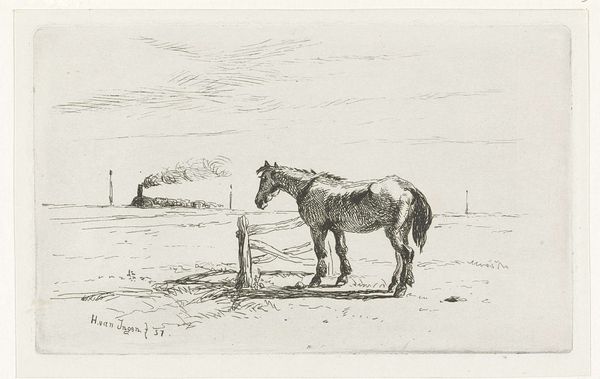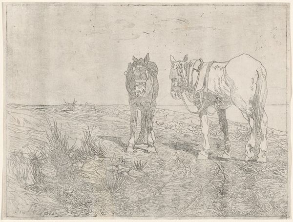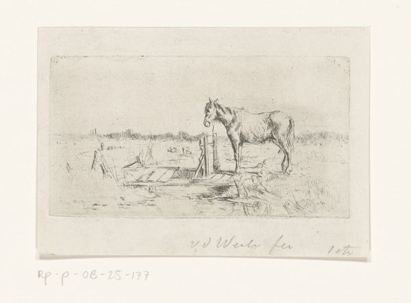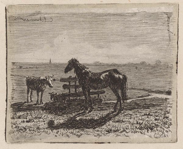 Cornelis Albertus Johannes Schermer created this print of a pasture with a horse and two cows. Schermer was active in the second half of the 19th century, a time when Europe saw significant transformations in agriculture and land use. This etching depicts a rural scene, reflecting the Netherlands' deep connection to its agricultural roots. There is a sense of the pastoral idyll, yet it also hints at the economic realities of the time. The animals, central to agrarian life, stand quietly as if posing for the viewer, and it is tempting to see them as figures in a rural narrative. What is the relationship between the farmer and the animals that are central to his livelihood? The print's modest scale and muted tones evoke a sense of intimacy. It invites us to reflect on the changing roles of rural communities and their relationship to the land during a period of profound social and economic change. How does this artwork contribute to or challenge existing depictions of rural life and labor?