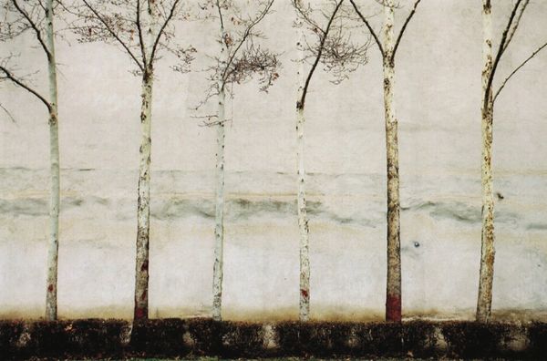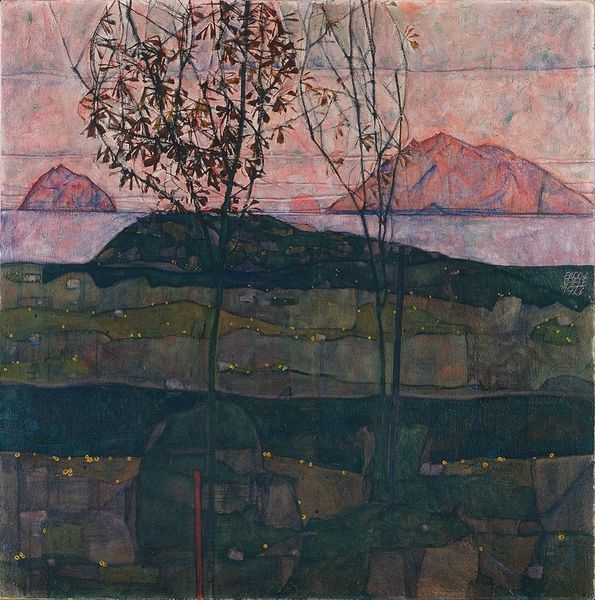 Editor: So here we have Egon Schiele's "Autumn Sun I (Rising Sun)" from 1912, an oil painting currently in a private collection. What strikes me immediately is its strange quietness – almost haunting in its simplicity. What do you make of it? Curator: Haunting is a perfect word! It has a kind of stark beauty, doesn't it? Those attenuated trees reaching up to a milky sky… The landscape is simplified, distilled, but intensely felt. What about those pops of unreal color on the tree trunks – that strange ultramarine? What does that do for you? Editor: It feels… artificial. Like nature is being forced or altered in some way, definitely not your typical landscape colors. Does that unnatural color hold any particular symbolism? Curator: Perhaps! Schiele was exploring the psychological landscape as much as the physical one. These aren't just trees; they are embodiments of feeling. He distorts reality to reveal inner truths. The gaunt trees might symbolize loneliness or the struggle for survival, set against a backdrop of almost oppressive nothingness. The autumn setting emphasizes a feeling of fading and loss. The high sun makes me think about memory or nostalgia, casting harsh shadows, don’t you agree? Editor: Yes, it gives the scene a melancholic air, tinged with foreboding, very thought-provoking indeed. I never looked at trees so hard! Curator: Art holds a magic mirror, doesn’t it? I'll be looking at trees in a new way for a while myself now. Thanks to you.