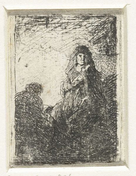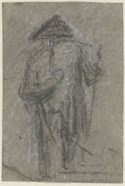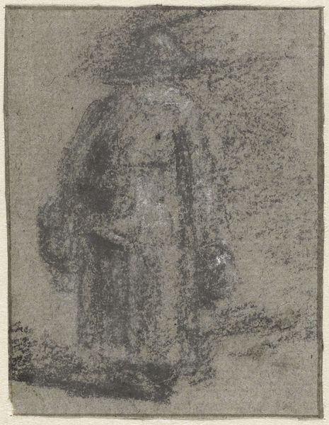 Curator: What a fascinating drawing. It certainly leaves an impression. Editor: Yes, this work entitled "Karikatuur van een staande dikke man", dating back to the period 1770-1825, and created by Simon Andreas Krausz, immediately strikes me with its peculiar use of pencil. The dense, almost chaotic, hatching that makes up this corpulent figure is striking. There is an intentional distortion. What are your thoughts? Curator: I agree. There's a tension in the way Krausz uses the medium to convey a subject so focused on the excesses of the time, the subject is literally inflated. Note how the artist's use of line directs your gaze through the composition, almost creating an echo effect by framing it within this pencil outline of an abstractly indicated background. Editor: And how does this composition situate the man within the artistic and social conventions of the era? The way he presents the gentleman suggests a critique of societal norms. Caricatures flourished then, often satirizing the wealthy or powerful, and how this drawing reflects an emerging sensibility against class-based hierarchies and aristocratic privileges, a sign of shifting values and a premonition of coming change, so to say? Curator: Certainly. Observe the minute details though, such as the subtle lines creating folds in the gentleman's attire, juxtaposed with broader, looser strokes defining his body mass. Editor: Interesting! But beyond this compositional and artistic analysis, it feels relevant to interpret this piece considering the context of Dutch society during the late 18th and early 19th centuries. Considering the emergence of bourgeois culture, a growing awareness of social issues, perhaps it can be interpreted as an indirect protest? Curator: I think you’re on to something. If you consider how the caricature amplifies specific characteristics, you are compelled to investigate what these exaggerations represent in connection with society’s values. Editor: Precisely. It serves as a window into the Dutch mindset of that era, making the historical implications deeply ingrained into the materiality and symbolic charge of "Karikatuur van een staande dikke man". It speaks volumes about the evolution of values in the age when empires started crumbling to give birth to something totally different. Curator: This encounter with history offers us a new perspective of an otherwise intriguing formal arrangement! Editor: Indeed, thank you for walking me through this pencil landscape, shedding new light on societal history from behind the marks of the pencil.