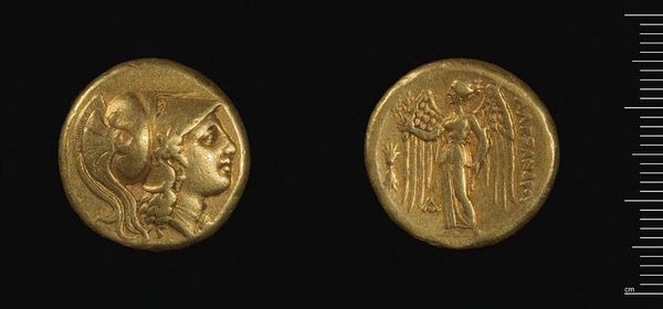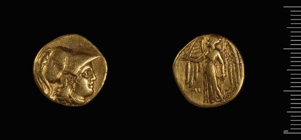 Curator: This is a gold stater, attributed to Alexander the Great, a man who shaped much of the ancient world. Editor: It's striking, even at this scale. The gold has a warmth that almost makes you forget the conquests it financed. Curator: These coins were critical. Minted across Alexander's vast empire, they served as propaganda, legitimizing his rule through standardized imagery. Editor: And what images! Athena, a goddess of strategic warfare, is prominently displayed. It's a clear message about power, isn't it? It’s about control. Curator: Absolutely. And on the reverse, Nike, the winged goddess of victory, reinforces that message. The imagery cements Alexander's status as a divinely ordained leader. Editor: It makes you wonder about the lives touched, or rather crushed, by this ambition, and how images normalize power. Curator: It's a potent reminder of the relationship between art, power, and the shaping of historical narratives. Editor: Definitely, analyzing these coins forces us to confront the complexities of how leaders are made, and how we, even now, perceive them.