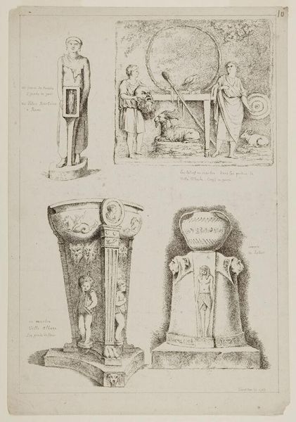 Curator: This is a fascinating collection of sketches by Jean-Claude Richard, Abbé de Saint-Non, showcasing various sculptural designs. I see influences from Egyptian art to Greco-Roman themes, reflecting the period's fascination with antiquity. Editor: Wow, it's like a mood board for garden ornaments! The figures feel a bit stiff, but there's a quirky charm to their arrangement, almost like the artist was playing with ancient IKEA instructions. Curator: Indeed, the juxtaposition of different cultural elements, particularly the Egyptian figures with classical motifs, reveals the complex power dynamics inherent in the colonial gaze of the era. These were designs intended for wealthy patrons, reinforcing social hierarchies. Editor: So, were these ever actually built, or are they just daydreams in ink? I imagine these fountains gurgling with secrets in some forgotten courtyard, a visual symbol of dominance. Curator: Some may have been realised, though many probably remained as proposals. Saint-Non's role was crucial, connecting artistic ideas with social and economic capital. Editor: It makes you wonder, doesn't it? All that stone, all that labor, just to make a splash! Still, there's a strange allure to these idealized forms, a promise of beauty, even if it's laced with unequal power. Curator: Precisely, and reflecting on Saint-Non's sketch collection compels us to interrogate the legacy of such artistic and social constructions. Editor: Absolutely, I think this drawing reminds us that art isn't just about beauty; it's about who gets to decide what that beauty looks like and what it represents.