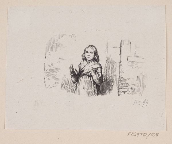 Jozef Israëls created this delicate sketch of a standing girl leaning on a wall, now held at the Rijksmuseum. The drawing is dominated by subtle gradations of tone and finely hatched lines, creating a quiet, contemplative atmosphere. The subject is simply rendered, with a focus on the play of light and shadow. The girl, positioned slightly off-center, is framed by the stark geometry of the wall. Her figure is delineated with spare, fluid lines that emphasize her youthful form. Notice how Israëls uses cross-hatching on her arm to suggest depth and volume. The simplicity of the composition and the muted palette direct our attention to the texture of the paper and the delicate touch of the artist's hand. This emphasis on materiality and form reflects a broader artistic shift towards valuing the intrinsic qualities of the medium itself. The very act of sketching becomes a subject in itself. This self-awareness invites us to consider not just what is depicted, but how it is depicted, highlighting the constructed nature of representation itself.
