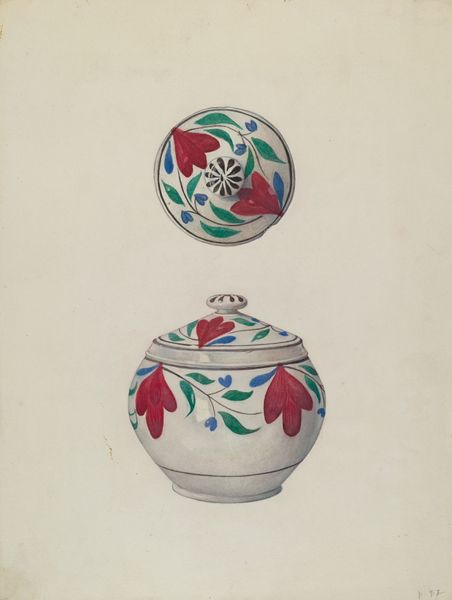 Editor: This is Edward White’s "Sugar Bowl," circa 1936, rendered in watercolor and drawing on paper. It’s charming, almost like a design sketch. The shadows feel modern, yet the floral design has an older feel. What catches your eye about it? Curator: I’m interested in this period, the mid-1930s. Notice how a seemingly simple ceramic sugar bowl, something so domestic, is elevated to an art object. It speaks volumes about the shifting perceptions of craft and design at the time. Does it strike you as merely representational, or something more? Editor: I suppose the focus on it alone, isolating the sugar bowl, does suggest it's meant to be more than just a picture of a sugar bowl. But what specifically was shifting? Curator: Mass production was well underway. There's a renewed appreciation, especially within artistic circles, for handcrafted items, for design itself as an art form. This could also reflect the broader context of the Depression era; elevating everyday objects could be a commentary on finding beauty in the mundane and accessible. Does this perhaps read as "high" or "low" art to you? Editor: It’s certainly not trying to be overtly grandiose or… high art. So you're suggesting it challenges existing notions of fine art by highlighting a common, functional object? Curator: Exactly. And by focusing on a mass producible form with decoration, White’s piece may subtly comment on the societal and class dynamics linked to accessibility, and production trends, making it part of a visual culture conversation of its time. Editor: That’s fascinating! I wouldn’t have considered that from just looking at a pretty sugar bowl. Thanks! Curator: It just highlights how something so seemingly simple is a window into understanding the public role and the political implications that art can portray!