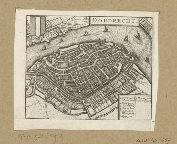 Curator: What strikes me immediately about this old plan of Arnhem—probably made between 1652 and 1678—is its intricate neatness. Everything’s so ordered, like a little puzzle. Editor: Yes, there’s a deliberate clarity here, but what's interesting is that city maps weren't simply about geographical accuracy; they were about making a statement. See how the river hems in the composition. The image exudes control. The pen and ink, combined with the engraving, give a graphic strength to it, defining power with visual accuracy. Curator: Power, huh? I was thinking more about the human stories within those walls. Like imagining families clustering around tiny hearths within those densely packed buildings, little stories making up the whole tapestry. It has a really grounded feeling to it. I can't help thinking how artists would interpret it differently now, with so many angles and stories that could be derived from it. Editor: Absolutely. It shows cultural memory—it echoes the medieval tradition. This anonymous mapmaker shows the power, the walls—which are very well-defined—protect the church. It highlights the structure, that feeling of civic stability within those ramparts, not so much the stories being written there, however potent. The walls symbolize much more than merely what keeps invaders away. Curator: True, but it also makes you wonder what liberties they took in the depiction. I mean, look at that coat of arms. How much of that’s symbolic versus a literal attempt at civic branding? Do we buy into the heroic narrative, or is it something subtler, a feeling of longing? Editor: The artist, in using symbols of the ruling family of the area in that time period is showing us the power structure; those symbols can have a deep and sometimes troubling psychological and cultural weight; there may well be hidden narratives we may not understand now. Curator: It definitely asks us to step back, to appreciate how deeply symbolic even an apparently simple plan like this can be. I think the tension between those levels makes it really appealing to a contemporary audience. Editor: Indeed, that echo of stability and deliberate display invites viewers to delve beneath that crisp ink and ask themselves about not only then, but now too.