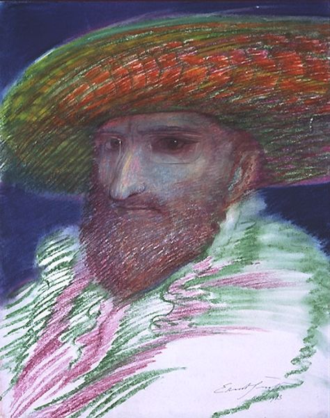 Here is a self-portrait by Ernst Fuchs. At first glance, the painting is dominated by an interplay of warm orange tones, set in contrast with the cool blues and greens of the subject’s hat and garment. Fuchs's brushwork is expressionistic. Thick, textured strokes define the contours of his face and beard, giving the portrait a tactile, almost sculptural presence. Semiotically, the self-portrait becomes a canvas where the artist encodes his identity through a visual language of colour and form. The striped pattern, particularly in the hat and clothing, is not merely decorative. Rather, it symbolizes a spectrum of experiences, challenging fixed identities. Note how the choice of an intense orange as background destabilizes the traditional use of color in portraiture. It pushes the painting beyond mere representation, transforming it into an exploration of the artist’s inner landscape. The formal qualities of Fuchs’ self-portrait thus function as part of a larger philosophical discourse, where the self is portrayed as dynamic.