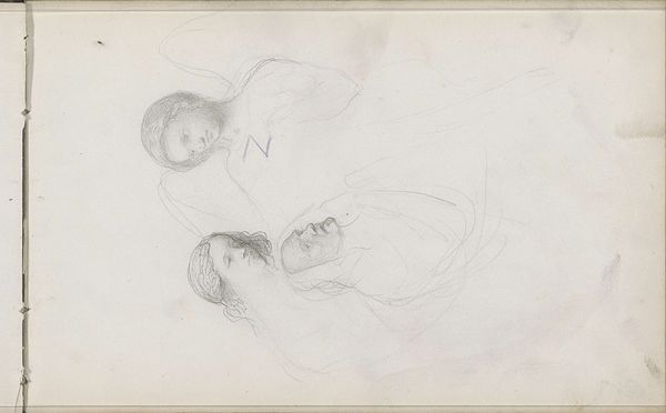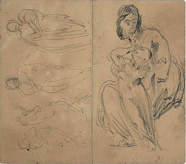 Curator: This drawing, "Moeder met kind" from around 1858, by Bastiaan de Poorter, is made with pencil. There's a tentative, unfinished quality to the pencil strokes that I find quite captivating. What are your first thoughts? Editor: The softness of the pencil creates such a tender scene. It looks like a sketch, maybe a study for a larger painting, focusing on the relationship between the mother and child. What do you see in this work beyond the surface depiction? Curator: For me, it's fascinating to consider the materiality of this work – a humble pencil on paper – against the backdrop of the mid-19th century and its social upheavals. What kind of labor produced this image, and for whom? Was this for public consumption, or a more private endeavor? How does that change our perception? Editor: That's interesting, I hadn’t thought about it in those terms. Was pencil drawing considered 'lesser' than painting at the time, because it was cheaper or quicker to produce? Curator: Precisely! The "means of production" matter. Pencil wasn't yet fully embraced by the fine art establishment. Its association was often with preliminary sketches or "women's work", considered more appropriate for delicate hands and domestic spaces. Could de Poorter be making a conscious decision by choosing this accessible, almost democratized medium? Editor: So, the act of choosing pencil itself becomes a statement. And thinking about “women’s work," the subject matter of mother and child also becomes intertwined with labor and gender roles, then. Curator: Absolutely. By representing this archetypal image, perhaps De Poorter aimed to elevate the everyday. This might make us think of the working-class mother and how they spend their days. He reframes their emotional, invisible labor in a material form. It’s all interwoven: medium, subject, social perception. What will you take from our discussion? Editor: Considering the social and material context really enriches my understanding. I am definitely going to think more about artistic choices. Curator: Excellent! Remember, art doesn’t exist in a vacuum, everything has a history of making and production.