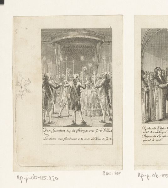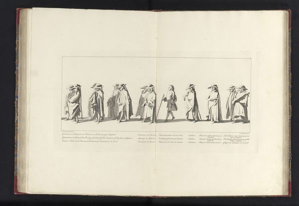 Jan Punt created this print titled 'Lijkstatie van Willem IV, 1752, plaat 20' in 1752. It is a scene of William IV’s funeral procession. During the 18th century, the Dutch Republic was undergoing significant political and social changes, including the rise of the House of Orange. Willem IV's reign was marked by attempts to centralize power, reflecting the ongoing tensions between republican and monarchical ideals. The elaborate funeral procession depicted here would have been a display of power, aimed at legitimizing the ruling family. The figures carrying flags represent the various states and regions under the rule of Willem IV. Note how each figure is rendered with a solemn expression, emphasizing the gravity of the occasion. The print offers insight into the performance of power and grief, underscoring the importance of dynastic succession in a changing political landscape.