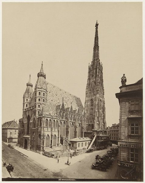 Curator: This gelatin silver print captures a view of St. Stephen's Cathedral in Vienna, taken by Hermann Heid sometime between 1865 and 1891. Editor: Immediately, I'm struck by the sheer verticality of the composition. The spire, in particular, dominates, almost piercing the sky. And this subdued, almost sepia tone gives it such a unique antique presence. Curator: Yes, Heid’s choice of gelatin silver perfectly complements the Gothic architecture, emphasizing the texture of the stone and the intricate details of the cathedral's facade. I'm intrigued by the complex layering of the towers and the geometric precision of the roof. Editor: Looking at the carriages lining the square, it makes you consider the sociopolitical power represented by such monumental architecture at that time. Religious spaces were always more than just that. Curator: Indeed, the photograph's technical composition is masterful. Heid uses light and shadow to define the architectural forms, drawing our eye upward. This perspective emphasizes the craftsmanship inherent in this feat of engineering. Editor: But what of the human cost? How many labourers died building such elaborate structures? Was Heid interested in portraying this perspective through the sheer size of the architecture against the urban space, suggesting the weight and influence of religious institutions on city life? Curator: That's certainly one interpretation. But I would suggest that we appreciate Heid's sophisticated deployment of scale and perspective to amplify the aesthetic presence of this famous European landmark. His technical control transforms this imposing architectural body into a work of striking visual harmony. Editor: And the subtle gradations of tone invite deeper reflection on our relationship to architectural legacies as markers of cultural memory and social control. It is more than just capturing symmetry and aesthetics, but really documenting complex issues. Curator: A beautiful, compelling document that brings together aesthetic ambition with meticulous historical accuracy. Editor: Precisely. Let us think about it critically.