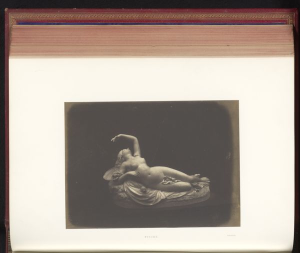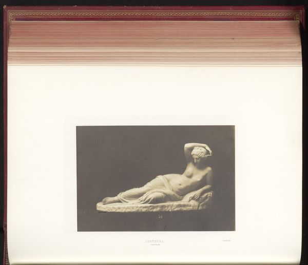 Curator: Immediately, the overwhelming impression is one of contrasting textures—the smooth, polished marble of the woman against the rough, bristling mane of the lion. There's an intense physicality in this juxtaposition. Editor: And physicality was certainly at the forefront in 1851 when Guillaume Geefs exhibited this very sculpture, titled "Sculpture of a woman with a lion," at London’s Great Exhibition of the Works of Industry of All Nations. The image we see here documents its display at that landmark event. Curator: Its display context explains so much. Considering this was showcased at an exhibition celebrating industry, it is clear that it served less as a portrait, and more as an ideal type or symbol. A powerful female figure sits, calm and self-possessed, seemingly taming a lion with minimal effort. Her hand gently strokes the beast’s face. Editor: Absolutely, and that contrast also speaks volumes about Victorian societal ideals, doesn’t it? The lion, representing raw, untamed nature, is subdued by female virtue, reflecting imperial power exerted with supposed benevolence. These nationalistic aspirations of civilization emerge in sharp detail, right? Curator: Undeniably, the sculptor has emphasized this control through specific compositional choices. Look at how the lion's body forms a horizontal line, creating stability, while the woman's upright posture signifies her dominance. The flowing drapery echoes the mane, softening her powerful stance. Editor: That's right. It becomes clear how the Romantics used classicising styles to comment on the cultural politics and ideals of their day. But also keep in mind the art world’s growing middle class— the market system made public spectacles out of art by celebrating individuality through commissioned works such as this. Curator: I see that interplay clearly in the refined modelling and idealized form of the woman. Her features are smooth, almost generic. The light caresses the marble, lending a cool, almost ethereal glow, typical of Neoclassical influence, but romanticized for added impact. Editor: Indeed. It also prompts considering how it would've functioned in that overwhelmingly spectacular display among other objects. Its meaning was dictated not just by what the sculptor put in, but where the sculpture was placed. I wager most viewers might've glossed over the message altogether while gawking at its immaculate material realism and sheer skill of carving marble. Curator: Ultimately, then, Geefs’s artwork acts as a potent distillation of Victorian power dynamics rendered in a precise, material form. The woman dominates, both physically and symbolically. Editor: And, on the whole, as cultural and aesthetic object, its success stems less from how clearly it makes any claims about female dominance and far more from how it so neatly facilitated imperial fantasies, both on a micro and macro level.