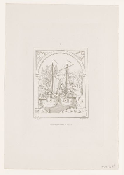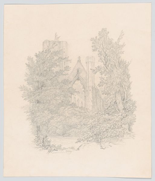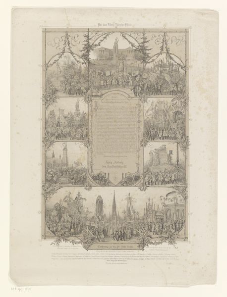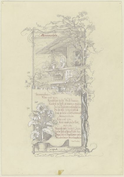 Curator: At first glance, this delicate rendering evokes a sense of wistful longing, almost like a pressed flower found between the pages of an old book. Editor: Indeed. Today, we’re observing "On the Grass," a mixed-media piece using ink, gouache, and pencil on paper by Minna Roberth, created around 1894. It's currently held at the Städel Museum. Curator: The central image, bordered by floral motifs, depicts what seems to be a small roadside chapel overlooking a serene pastoral landscape. The cross atop the chapel and the inscribed verses lend an aura of quiet contemplation and devotional memory to the scene. It is almost as if Roberth is recalling personal experiences with the intersection between nature and religion, so crucial to daily life for some Europeans at the time. Editor: Formally, the piece fascinates me. The composition contrasts the soft, almost dreamlike, quality of the landscape with the more precisely rendered architectural details and textual elements, enclosed within a structured, decorative border. This juxtaposition creates a fascinating visual tension between the idealized natural world and human attempts to organize and interpret it. It calls to mind similar formal tensions found in Secessionist artworks in the 1890s. Curator: Absolutely. And the flora, which serves as both border and ornamentation, acts as a visual metaphor. Vines intertwine with text and structure, signifying perhaps how cultural and natural memories blend in human consciousness. Note also how these natural and cultural signs envelop both nature and buildings. Editor: The limited color palette and precise linework add to the sense of intimacy and delicacy. It’s as if the artist captured a fleeting, cherished memory. Curator: A cherished memory, precisely. It embodies a poignant yearning for simpler times, laden with symbolic layers interwoven with personal experiences. Editor: A skillful orchestration of formal elements contributes to the piece’s emotive power, imbuing the viewer with a contemplative perspective. Curator: So it encourages us to examine the silent but powerful language through which memory and culture work together. Editor: Indeed, a convergence between method and emotional substance.