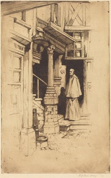David Young Cameron made this etching, titled 'Le Puits', in the late 19th or early 20th century, at a time when printmaking was experiencing a revival as an original art form. Cameron, as a Scottish artist, often depicted architectural subjects and landscapes. This piece gives us a glimpse into a rustic scene with an imposing figure who seems to be a monk. The figure's presence in this intimate domestic space prompts us to consider themes of faith and the everyday. The composition draws your eye into the shadowed doorway, as the figure creates a focal point that holds both serenity and a quiet tension. Cameron’s expert use of the etching technique allows the shadows to create depth, while the delicate lines give a sense of texture to the stone, wood, and fabric within the scene. In a way, it invites us to contemplate the intersections of religious life and the common routines of the past.