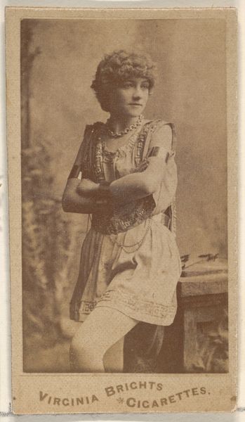 This is a lithograph of Jessie Cameron, from the Actors and Actresses series, created by Allen & Ginter. The sepia tones of the print contribute to a subdued yet focused composition. The actress is seen holding a tambourine above her head, which draws the eye upwards, creating a sense of movement. The composition is structured around a clear vertical axis, with the figure's body forming the central line, balanced by the accessories she holds and wears. The use of clothing— the apron, the top and the corset— serves to delineate the form, breaking it down into geometric segments. This segmentation emphasizes the materiality and constructed nature of the image itself. The polka dots and stripes on the hem of the skirt inject an element of visual contrast, highlighting how pattern can disrupt a fixed reading of the image. This piece functions not merely as a portrait but as a complex arrangement of forms that challenges conventional representations of image construction.