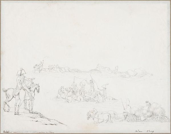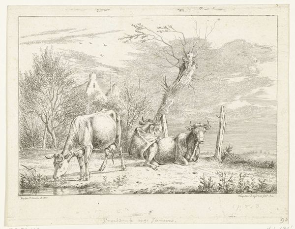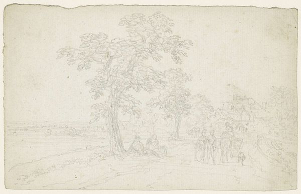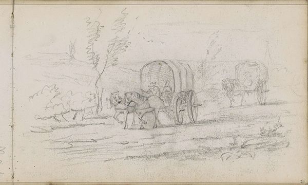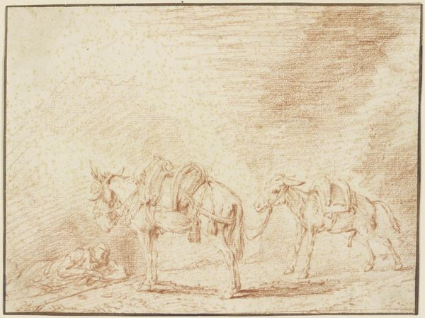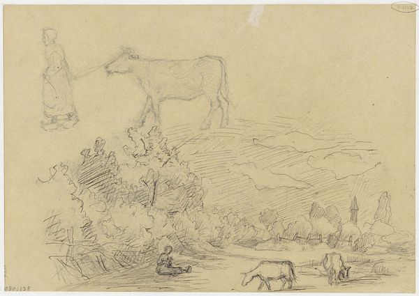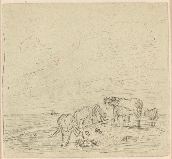 Curator: This is “Schets van een Ossendrift,” or “Sketch of a Cattle Drive,” created sometime between 1752 and 1819 by Jurriaan Andriessen. It's a drawing done in pencil and graphite, here in the Rijksmuseum. Editor: There's something incredibly serene about this, despite the subject. The pale graphite gives it an almost ethereal quality, like a half-remembered dream of rural life. Curator: It’s intriguing how a seemingly simple scene, cattle being herded, resonates with broader cultural narratives of the time. Andriessen, like many landscape artists, wasn’t merely depicting scenery. He was participating in a conversation about the ideal landscape, often tied to notions of national identity. Editor: Do you see any particular visual markers of Dutch identity, or is it more generalized? It's spare. Almost elemental. Curator: More generalized, I think. But consider the historical context. The late 18th century was a time of political and social upheaval. Idealized landscapes, even as sketches, served as visual anchors, providing a sense of stability and continuity during times of uncertainty. The cows could represent rural economic power in a nation dependent on its agrarian base. Editor: So the art provides a kind of silent propaganda? The gentle scene suggests safety in agrarian values, but avoids actually addressing socioeconomic troubles that likely existed at the time for those outside the wealthy class? Curator: Not necessarily propaganda, but it presents a specific, arguably optimistic, point of view on society. I agree on the lack of labor pains, but propaganda is always too intentional, and artists can't really have a full grasp on how future peoples will read their signs and symbols. Now, tell me, what visual elements resonate with you most? Editor: The stark lines against such light values. Look how he etches just enough to get you to recognize those bovine shapes. It’s incomplete but utterly descriptive. It reflects our habit as viewers to assemble complete visions from minimal stimuli. It touches something deep in human symbol interpretation. Curator: A keen observation. It really reveals how preliminary drawings can highlight the bare essence of perception and symbolic recognition, stripped of ornate detail. Editor: Looking at this piece again, I think I am going to ruminate about my own idealized visions, my symbolic associations that lead to my happiness. This piece helps highlight that power in artistic expression. Thank you for guiding my perception! Curator: My pleasure, indeed! It has been a refreshing reexamination for myself, too. Thanks.