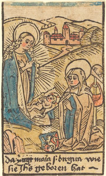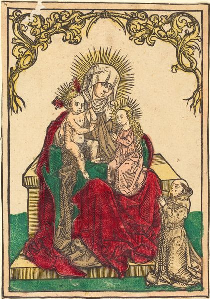 This tiny oval woodcut, ‘Madonna and Child’, probably comes from 15th-century Germany. It shows Mary holding the infant Jesus, both figures framed by a burst of light. The print is hand-colored, a common practice at the time, and its small size suggests it was made for private devotion. Woodcuts like this were relatively cheap to produce, making religious imagery accessible to a wider population beyond the wealthy elite who could afford painted panels. The lack of a known artist is revealing as, at this time, art production was increasingly governed by the guild system. The image carries clear messages, designed to reinforce religious beliefs and social norms. The iconography of the Madonna and Child would have been instantly recognizable and comforting to viewers. To understand the true context, one must research the complex interplay of religious beliefs, social structures, and artistic practices that defined the period.