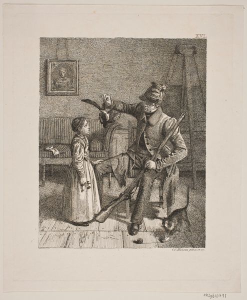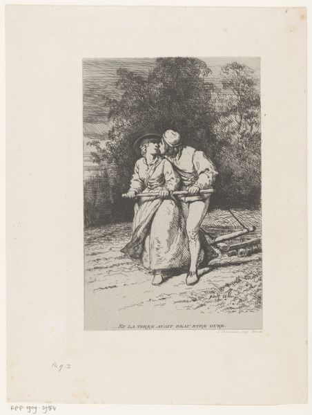 This print, made by Frederik Hendrik Weissenbruch, captures a fleeting moment between a farm girl and a young man. The medium used here is called ‘tintometrie’, a printing technique that allows for subtle gradations of tone. The image shows that the artist was deeply interested in the lives of everyday people. The girl’s clothing, for example, isn’t rendered with photographic precision, but with an eye to its texture and weight, suggesting the labor involved in producing and maintaining it. Weissenbruch carefully details the young man’s suit, worn and patched, a visible sign of his own labor. The landscape around them isn’t just a backdrop; it’s a space of work and production. In his choice of subject and medium, Weissenbruch elevates the ordinary, inviting us to consider the value and dignity of working-class life. The artwork's beauty resides not only in the image itself, but also in the story of its making and the world it represents.