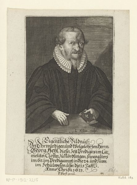This is Christian Romstet's portrait of Johann Benedikt Carpzov, made with etching. The composition divides into three horizontal bands: the inscription, the sitter’s body and hand gesturing to a book, and the sitter's head encircled by an elaborate ruff. This structure draws the eye upwards. Romstet uses a play of light and shadow to suggest the volume of Carpzov's form, lending a sense of presence. The texture is created through fine, parallel lines characteristic of etching, lending depth to the fabric of the robe and pages of the book. Romstet uses the formal qualities of the print medium to define a visual and intellectual space, reflecting the subject's identity as a figure of scholarly and religious authority. The book, the gesture, the ruff—all function as signs within a semiotic system, speaking to Carpzov’s status. The portrait, therefore, is not just an aesthetic object but an exercise in constructing meaning.