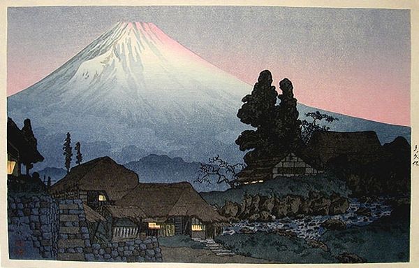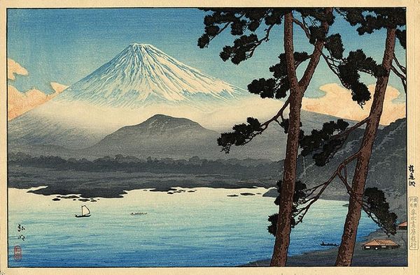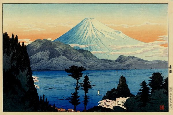 Editor: This is "Fuji from Hakone," a 1932 woodblock print by Shotei Takahashi. It's quite striking; the snow-capped Mount Fuji dominates the skyline over these shadowy hills. What can you tell me about it? Curator: Well, considering this ukiyo-e print, let's consider its historical context. The early 20th century saw the rise of Shin-hanga, which revitalized traditional woodblock printing, integrating Western Impressionist influences. What effect do you think this integration has on the work's accessibility to a broader, potentially Western, audience? Editor: I think the more impressionistic rendering of the sky gives it a dreamier, universal appeal, a softening of the traditional Japanese print. The bold use of color is new to me. Curator: Precisely. The pre-modern era expected that artists served the propagandistic efforts of those in power. However, after that obligation diminished, artists became increasingly keen to pursue their own interests. Do you see evidence of this trend manifesting itself here, especially as it speaks to the consumption and appreciation of landscapes in the emerging leisure culture of Japan during the early Showa period? Editor: I can see that – it feels more like personal expression, like capturing a moment, as opposed to something strictly for the elite. The mountains become accessible to more than the rulers who live above them. Curator: Absolutely. Prints like these played a key role in shaping perceptions of Japan, both domestically and internationally. The beauty of Fuji was packaged for mass consumption. Editor: That’s fascinating; it’s like early tourism promotion! It makes you consider the motivations behind depicting this subject in this style and disseminating it. Curator: Exactly. Considering art through the lens of cultural production provides new avenues to explore art, challenging its autonomy by focusing on socioeconomic history and consumption. Editor: That’s definitely a fresh perspective for me, viewing a serene landscape as part of a larger system of image production and cultural identity! Curator: It encourages you to think about art’s purpose beyond aesthetics.