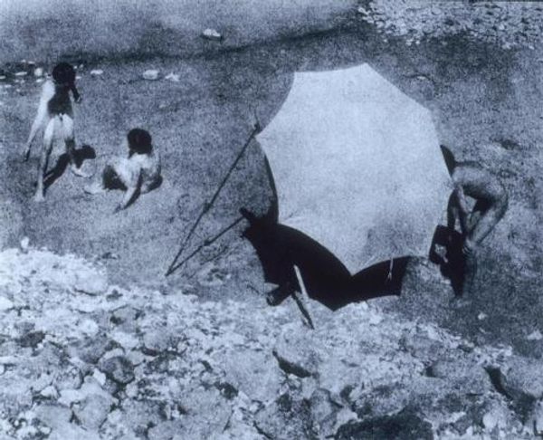 Editor: This is Kazuo Shiraga's "Challenging Mud," a black and white photograph from 1955 documenting a performance. There's something incredibly raw about it, watching a figure seemingly struggle in this... mud pit. What do you see in this piece? Curator: Well, it’s not just mud, is it? It’s a site of production. This performance, captured in photography, pushes the boundary between painting and action, almost an anti-form. We see Shiraga physically engaging with the base matter, not as a neutral ground, but as a resistant material. Consider the labor involved, the very act of making a mark or being consumed by it. How does this challenge your notion of art-making? Editor: I see what you mean. It's not just the mud, it's the act of wrestling with it. Almost like he’s not making an object but experiencing something, or… documenting an endurance of sorts. Is it meant to be unsettling, do you think? Curator: Perhaps unsettling is a result of a deliberate attempt to undo the preciousness associated with art object and ideas of “purity” and “genius” of the individual artist. Here, the physical exertion and primal engagement point towards materiality of making: this body, that mud, that instant frozen for our contemplation. Don’t you think that the viewer is drawn into the process, or invited to consider the artist’s actions in ways quite distinct from considering art history's fixed paintings or sculpture? Editor: Absolutely. It makes me think about what art *is*, if something like this – a fleeting performance, documented – can be just as valid as, say, a painting meant to last centuries. Curator: Precisely. And the photograph itself – the means of production, the chemical processes – becomes integral to the artwork’s understanding, not simply a record. It prompts questions about documentation, reproducibility, and the very social context of artistic creation. We consume this captured action, but can never truly inhabit its origin. Editor: That’s fascinating. I never considered how the means of documenting something could become so central to its meaning. Thanks for opening my eyes! Curator: My pleasure! Considering art this way encourages us to see not just the object, but the whole complex system surrounding it – the materials, the labor, and ultimately, its cultural implications.