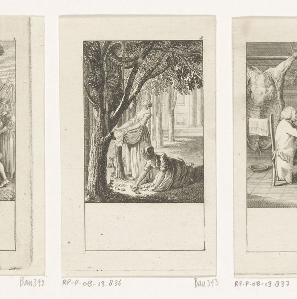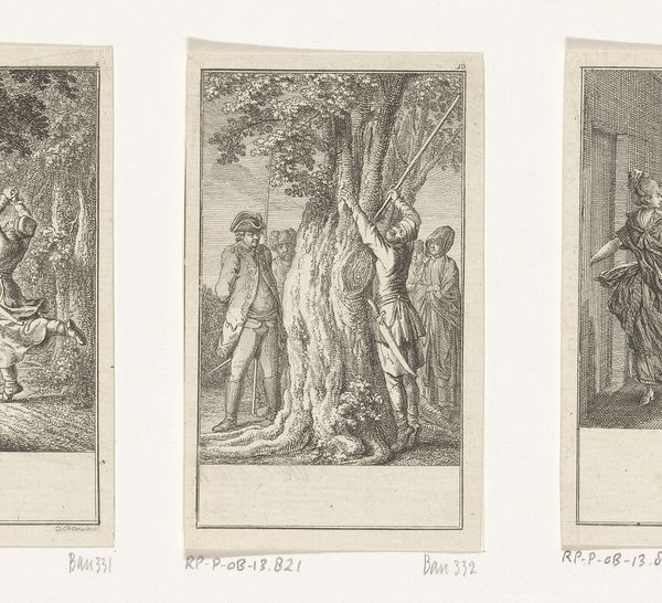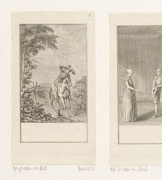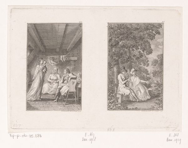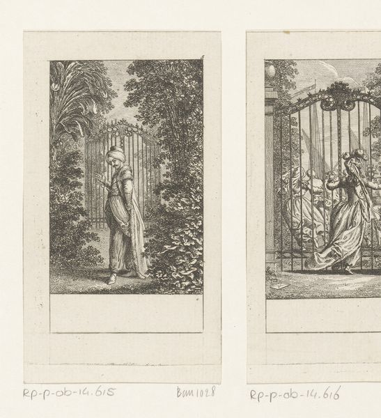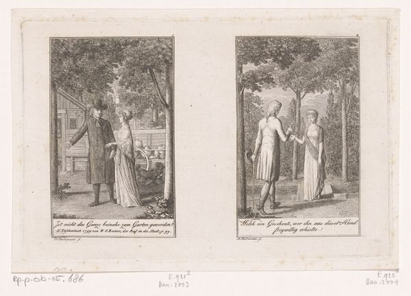 This engraving titled 'Man komt terug van een reis', was created by Daniel Nikolaus Chodowiecki, sometime before 1801. Notice the crisp lines etched into the plate, forming a scene of domesticity. The composition is structured around the architectural lines of the house and garden. A returning man is greeted on the steps by a woman, a tableau framed by trees. Chodowiecki masterfully uses hatching to define form and texture, bringing depth to the monochrome palette. The engraving functions almost as a set of signs. The man's posture, the woman's attire, and the setting itself can be interpreted through cultural codes of the time, offering insights into gender roles and social expectations. The print invites us to consider how such seemingly simple scenes encode complex social meanings, reflecting and reinforcing the values of its era.