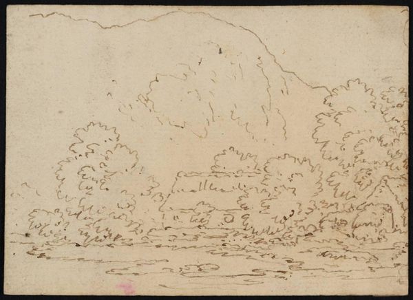 Editor: Here we have "View from the Ruins of Brederode" created in 1868 by Johannes Tavenraat. It’s a delicate pencil drawing in the Romantic style. It’s quite minimal, but the landscape is still somewhat legible. What do you see in this piece from your perspective? Curator: I see a deliberate act of documentation, shaped by available materials and the artist's labor. Look at the paper – it's from a sketchbook, implying travel, immediacy, and perhaps artistic training. Tavenraat used a humble pencil. This choice, a common, easily accessible tool, democratizes artmaking itself. Editor: So, the accessibility of the materials matters? Curator: Absolutely. Pencils allowed artists to move beyond traditional patronage and studios. They became portable, aligning with Romanticism’s focus on direct experience with nature. We have to consider that pencil production underwent industrialization during this period; a commentary on the relationship between nature and manufacturing can also be interpreted in this piece. This landscape becomes mediated through commercial tools. Editor: That’s fascinating. I never thought about the pencil itself being a manufactured object with a cultural context. How do the Ruins factor into it all? Curator: The ruins themselves represent a breakdown of previous material conditions. Feudalism and its structures of power had diminished by the nineteenth century. By portraying nature reclaiming old material remains, he may be commenting on labor, power and industrial manufacturing’s intrusion into these domains. Editor: This has changed how I see landscape art. I thought it was all about idealized nature, but you’ve shown it can also reflect the realities of material production and societal change. Thanks for the new insight! Curator: Precisely! It pushes us to examine art not just as representation, but also as a record of making, and its connection to societal power.