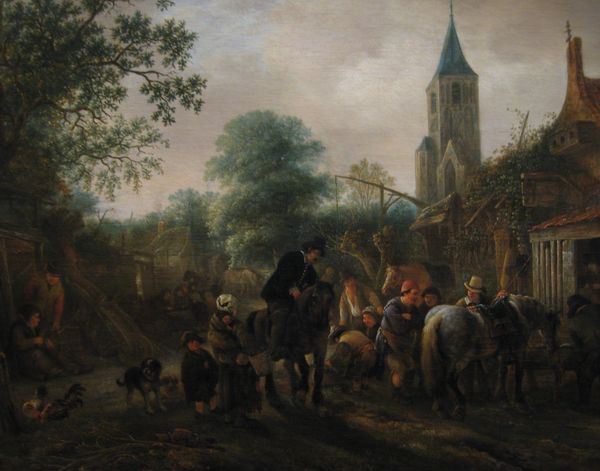 Isaac van Ostade created this painting, Travellers Halting at an Inn, using oil on canvas. The composition’s visual tension comes from the distribution of light and dark areas that create a sense of depth and atmosphere. Notice how van Ostade masterfully uses light to guide our eyes. The brightest areas focus on the figures and animals clustered around the inn, while the darker tones of the sky and surrounding landscape recede, creating a dynamic contrast. The inn itself, with its architecture, appears to be leaning to the right, adding dynamism to the composition. This is further destabilized by the loose brushwork, which brings out the textures of the building, clothing, and foliage. The artist's intention was not to represent a perfect, idealized reality. The scene appears as a collection of details that give us a sense of everyday life and the passage of time.