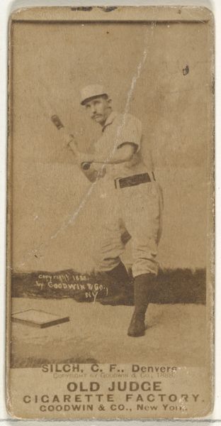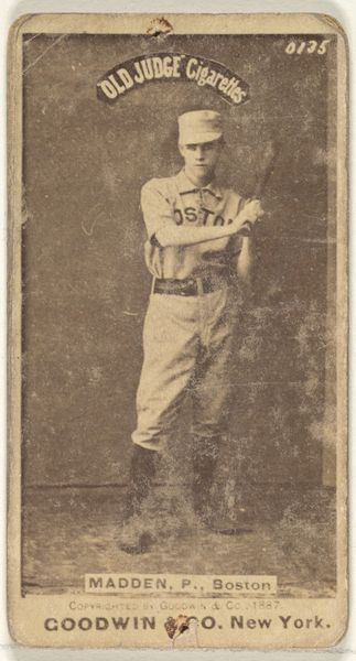 This baseball card of Geiss, a pitcher for Chicago, was produced around the turn of the century by Goodwin & Company as part of the Old Judge Cigarettes series. It's a humble object, made of thin paper stock printed with a sepia-toned photograph. The card's materiality speaks to a fascinating intersection of sport, celebrity, and consumer culture. At the time, baseball cards like these were not precious collectibles, but promotional items included in cigarette packs to boost sales. The Goodwin company mass-produced them using photolithography, a process that allowed for relatively quick and inexpensive reproduction. The image itself, capturing Geiss in action, speaks to the burgeoning popularity of baseball and the rise of sports heroes. It’s interesting to consider how the card's distribution – tucked into packs of cigarettes marketed to a wide audience - democratized access to these images. Ultimately, this card isn't just about baseball, it's about how images and objects circulate in society, shaping our understanding of value and fame. It's a reminder that even seemingly simple objects can reveal complex stories about labor, consumption, and the making of culture.