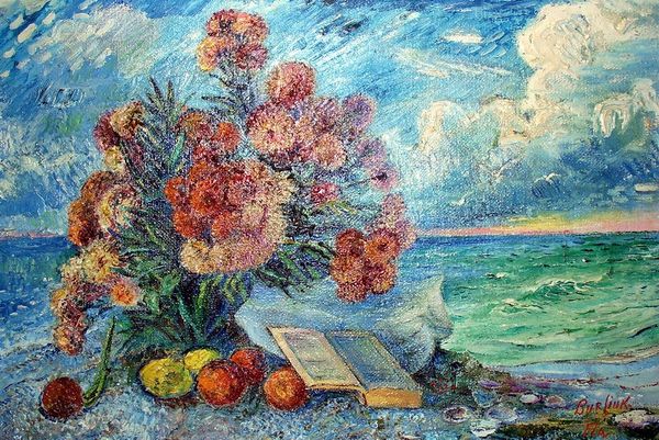 David Burliuk’s “Bouquet with Sunflowers with Landscape” uses the traditional materials of oil paint and canvas to create a scene of rural plenty. But look closer. See how the paint is applied not in gentle washes, but in thick impasto? This isn’t just about representation; it's about presence. Each stroke is a record of Burliuk's hand, his energy, his deliberate act of making. The sunflowers themselves, heavy with seed, seem almost sculpted from pigment. The landscape, a backdrop of tranquil water and sky, is equally tactile. Think about the labor involved in such a painting. Not just the artist's hand, but the production of the paint itself, the weaving of the canvas. Burliuk elevates these humble materials through sheer force of expression. He blurs the line between fine art and craft, reminding us that all art is made, not simply conceived. By emphasizing the material reality of his painting, Burliuk invites us to consider the value of labor, the beauty of everyday objects, and the transformative power of art.