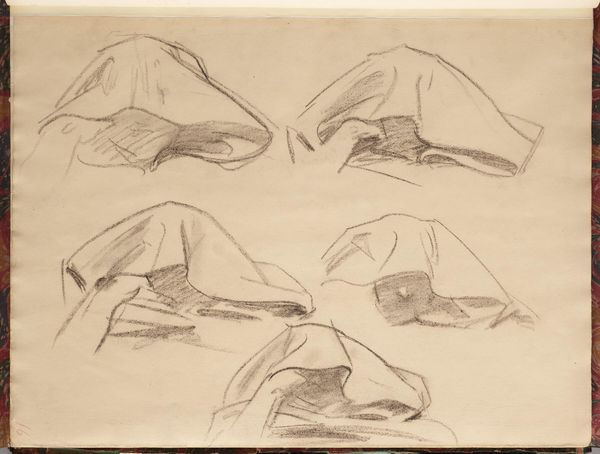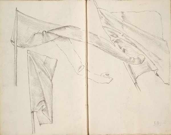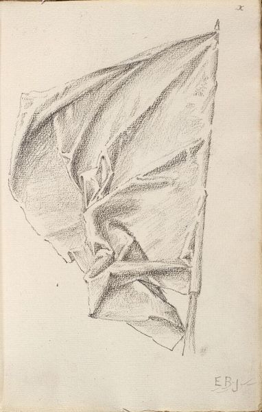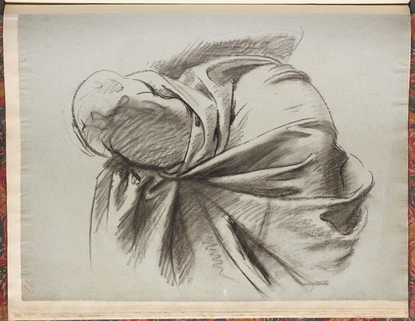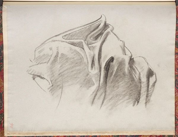 Editor: This drawing, "Drapery Study for the Law, 'Israel and the Law,' Boston Public Library," is by John Singer Sargent. It feels like a fragment, a close-up on something much larger. What symbols do you see at play here? Curator: The drapery itself, though seemingly simple, evokes ideas of covering, concealing, perhaps even revealing. Consider the law's role: to both expose and protect. What feelings does the interplay of light and shadow evoke in you? Editor: I feel a sense of both vulnerability and strength. Is that intentional, do you think? Curator: Sargent, in choosing drapery, taps into a long history of its symbolic use. Think of classical sculptures, where drapery signified status, morality, even divine presence. It's fascinating how a simple sketch can hold such complex layers of meaning. Editor: I never thought of it that way. Seeing the connection to classical sculpture really opens up new possibilities. Curator: Indeed. By studying these seemingly mundane objects, artists unlock profound cultural memories.