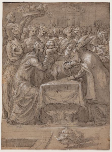 Curator: Right, let’s look at this intriguing piece, "Christ in the House of Simon the Pharisee" created around 1544 by Giorgio Vasari. It’s a charcoal drawing on paper, and what strikes me most is the sheer energy emanating from a scene we might typically imagine as serene. Editor: Serene? Not at all! My initial reaction is drama. The artist masterfully used charcoal to give it an ethereal glow that clashes delightfully with the chaotic assembly of bodies. And I notice a foot washing–there is nothing more symbolic than a foot being cleaned; like baptism! I’m thinking repentance, transformation, cleansing. Curator: Oh, I agree about the underlying sense of spectacle, I’d add intrigue too. The dynamism is created through the almost restless rendering of the figures, you can sense this is probably a preparatory sketch, the energy of which might be absent in the completed, so to say perfect, painting. Editor: Perfectly said. As a study, its immediacy leaps out! There’s an unpolished emotional transparency here, wouldn’t you agree? I would argue, it provides us a window into Vasari's initial impulses—a glimpse of his soul, if I may indulge in romantic flourish? The very fact that he uses chiaroscuro adds to the mystical symbolism in the image itself. Look at those shadowy outlines of people, looming...almost menacing! Curator: Oh yes! Shadows hold tales of half-seen meanings, I do love it. Speaking of meaning, there’s so much depth to be found in what feels, superficially, like a fleeting composition. Vasari captured a moment teeming with profound theological weight – human frailties clashing with the divine. It’s heavy...yet elegant! I would see that reflected in his heavy but also swift gestures across the page, just as elegant. Editor: Absolutely. Seeing it now in the Rijksmuseum we might lose track of the social dynamics and implications the theme may hold—like, imagine being at the top of the religious chain in those times, only to be challenged by the symbolic arrival and actions by this Messiah… This drawing keeps me pondering our history and the enduring power of visual symbols that cross centuries to speak with us now, centuries later. Curator: Indeed. This charcoal rendering of Vasari makes you dive right into that crucial juncture. Each hasty stroke feels deliberate, imbuing his "Christ in the House of Simon the Pharisee" with palpable tension. Editor: And this tension is exactly what speaks to me. That balance of shadows looming across bodies is very strong. It almost transforms what would be, otherwise, a calm setting into an everlasting moment of unease!