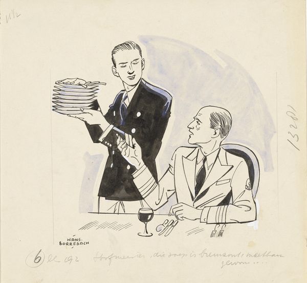 Curator: Here we have a pen and graphite drawing by Hans Borrebach, likely made before 1948. It’s titled “Man achter een bureau overhandigt Pepita een papier” – A Man Behind a Desk Hands Pepita a Paper. Editor: Gosh, there’s a story here, isn't there? The angular style makes it seem like some noir comic, or a frame lifted from a graphic novel, the air is thick with untold narrative! I can practically hear jazz in a smoky room… Curator: It certainly has that graphic quality. Borrebach worked as a caricaturist for various magazines. We can read this in terms of popular media and its reflection on societal roles within bureaucratic structures. Look at the setting: the imposing figure behind the desk versus the woman, perhaps applying for a job. Editor: Bureaucracy! Right, well, I prefer the soap opera version. Look at her expression, a kind of…resigned hopefulness? She *needs* that paper, but this man… He’s drawn in a way that screams self-importance. The stacks of books almost form a barrier. The light emphasizes his face like he's giving a performance, and not a charitable one. Curator: These roles and interactions weren’t neutral. Post-war Dutch society had clear ideas about labor and gender, powerfully shaped by visual culture, including work like Borrebach’s. One must always keep the historical context in mind. Editor: Oh, definitely, but even knowing that, it sparks something! Look, her clothing… simple but neat. Then there’s that little detail – the crumpled paper overflowing in the trashcan. Rejected applications? Broken dreams? Oh, give Pepita a break! I bet the note says, "You're hired, go home". Curator: It serves as a visual record. I suppose that beyond any intended message, a drawing like this also unintentionally reveals a little of the artist’s assumptions. A slice of life captured and framed. Editor: I love the ‘what if’ possibilities tucked into its stark lines. Art always gives you space to project and wonder, right? This quirky illustration is good evidence of the world and all its people.
