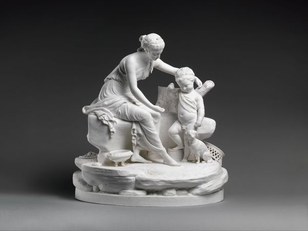 This is Hercules and Omphale, made of soft-paste porcelain at the Vincennes Manufactory in France around 1752. It depicts a scene from Greek mythology, where the hero Hercules is serving Queen Omphale as punishment for a crime. The sculpture is a product of its time, reflecting the Rococo style and the social values of the French court. The Vincennes Manufactory, later known as Sèvres, was closely associated with the French monarchy and catered to the tastes of the aristocracy. The choice of subject matter, with its emphasis on love, pleasure, and the power of women, would have appealed to the courtly audience. The mythological subject serves as a commentary on the social structures of its time. Understanding this sculpture requires examining the historical context in which it was made. Researching the patronage of the Vincennes Manufactory and the cultural values of the French court can provide insights into the artwork's meaning and significance. Art is contingent on its social and institutional context.