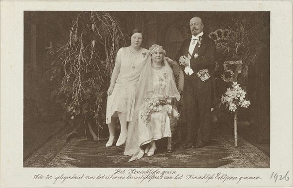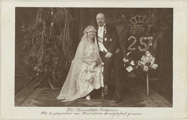 Curator: Here we see Franz Ziegler's 1937 photograph, "Portret van Juliana, koningin der Nederlanden, en Bernhard van Lippe-Biesterfeld," held here at the Rijksmuseum. Editor: It strikes me as remarkably composed. The contrasting dark and light tones give a depth that's uncommon for a photograph of this era. The figures are balanced well. Curator: The photograph captures Juliana and Bernhard on their wedding day. Ziegler was likely commissioned for this piece; how do you think that influenced the material conditions of its making and reception? Editor: Undeniably, this would affect his approach to composition and the application of tone and lighting. Look closely; there’s a very formal interplay of verticals created by Bernhard's saber, and the edge of Juliana’s veil. Curator: That interplay is interesting because photography in the interwar years existed within a rapidly changing media landscape, impacting social perceptions. Consider the shift from formal royal portraiture painting toward these types of press images intended for mass circulation. Editor: I suppose I hadn’t considered its dissemination in quite that way, but you’re right. It appears both artistic and functional. I find myself drawn to the background, the ambiguous depth creating a space which, if read semiotically, seems more idyllic than strictly representational. Curator: True. Let’s also consider the economic circumstances. Photography became increasingly affordable during this period, enabling wider participation. A royal wedding depicted via mass media offered a moment of unity during growing political divisions. Editor: It's also hard not to appreciate the stark formalism—that is, the clear, sharp focus on line and balance juxtaposed with an obvious desire for a soft, romantic aura that seems tailor-made to fulfill its social purpose. Curator: That romantic sensibility might be an appeal to more human values as society approached darker times, too. What looks aesthetically refined might, conversely, underscore how class dynamics operate within wedding portraiture. Editor: Ultimately, both interpretations circle back to the image itself, its internal architecture shaped as much by what it pictures, as it is by that picture's intent.