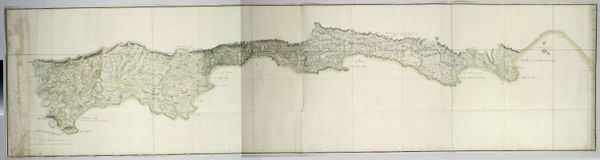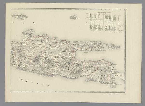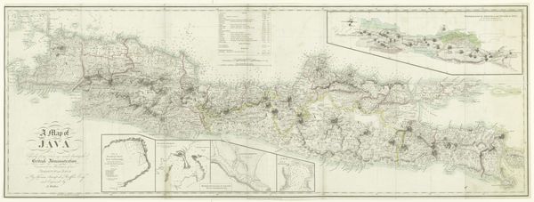 Curator: "Kaart van het rijk van Bantam, Jacatra en Cheribon," a map of Java from 1817 by C. van Baarsel en Zoon. It’s a meticulously rendered engraving and drawing, seemingly aged naturally. It feels so precise, yet also distanced from the physical reality it represents. What do you make of it? Editor: It's interesting how the detailed linework creates a sense of depth and texture, almost as if the map is a physical landscape in itself. The pen work must have been intensive! Given your expertise, could you speak to the role of material and labor in producing a piece like this in the 19th century? Curator: Absolutely. Think about the engraver’s skill: transferring knowledge, translating space and power dynamics onto a metal plate. Consider also where the raw materials come from, the logistical networks involved in distributing this information. And to whom? The map becomes a commodity, aiding Dutch colonial administration. Whose labor does it serve, and at what cost? Does understanding this context change how we interpret the map's "precision"? Editor: I hadn't considered the distribution aspect. So, beyond navigation, the map also becomes a tool for control and resource management. It prompts reflection about both the process and social impact. Curator: Exactly! Its beauty and technical skill are undeniable, but understanding its production forces us to confront the labor, materials, and consumption that fueled the Dutch colonial machine. These details, though seemingly inert, speak volumes about global power structures and resource extraction. The material reality isn't separate from the colonial agenda, but completely interwoven. Editor: It highlights the connection between art, power, and everyday materials. I’ll definitely look at historical art with a new perspective now!